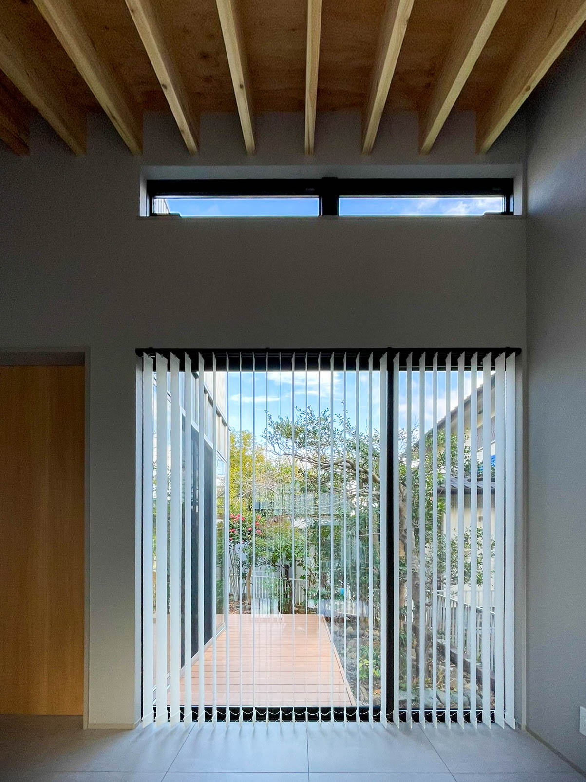 デザインの要は、構造材を現しにした化粧垂木の勾配天井です。アプローチの軒庇から続くこの天井が、柔らかな木質感とともに空間にリズミカルな表情を与えています。また、RC土間の階段アプローチや常緑樹、ウッドデッキが相まって、屋外との緩やかなつながりを感じさせる空間構成となりました。