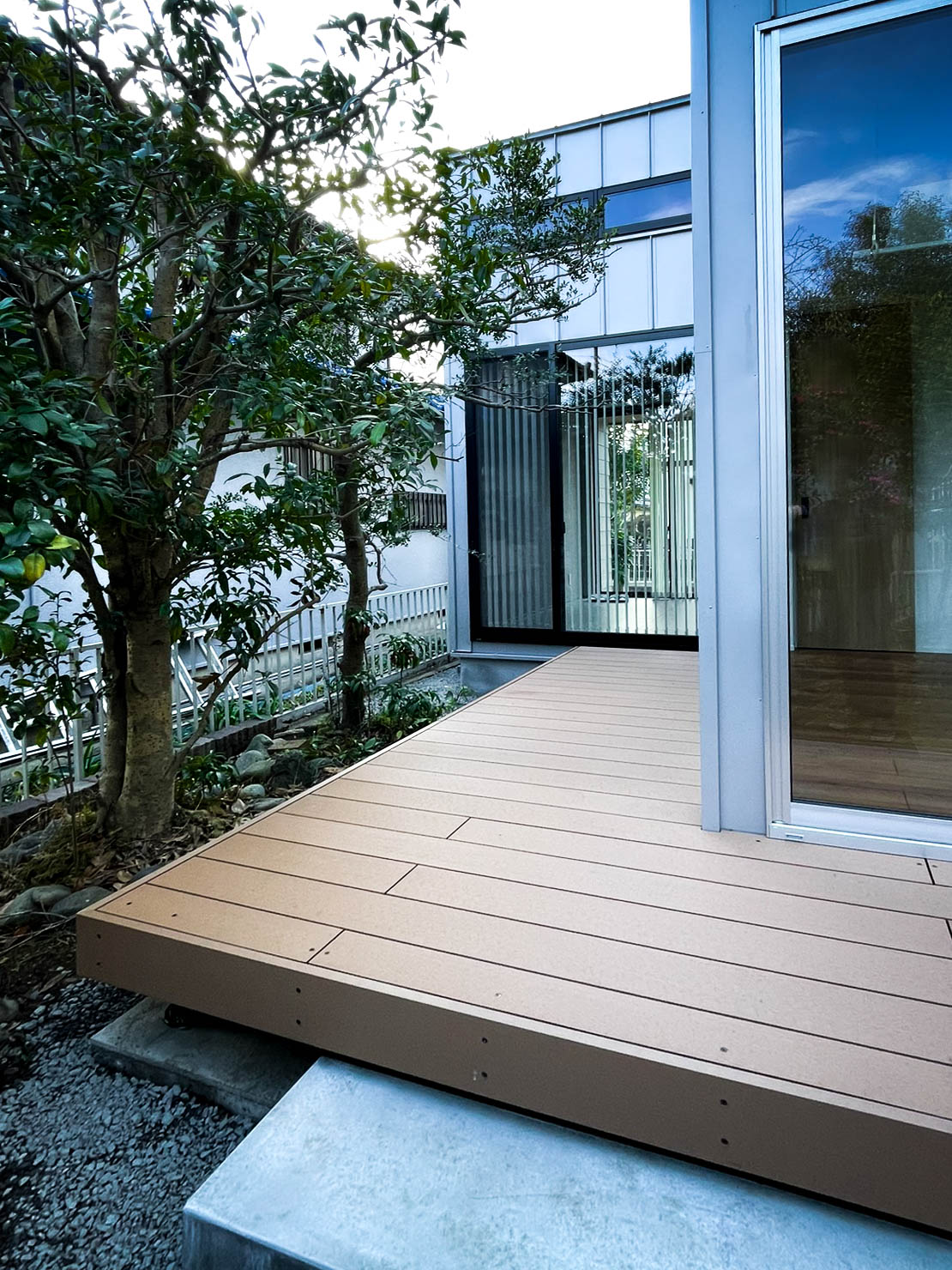 本プロジェクトは、保存樹木の借景を活かしたサンルームとワークスペースの増築計画です。建物と樹木の緩衝帯としてウッドデッキを配し、自然との調和を大切に設計いたしました。室内には自然光とともに樹木の陰影が映り込み、情緒豊かな景観が広がります。