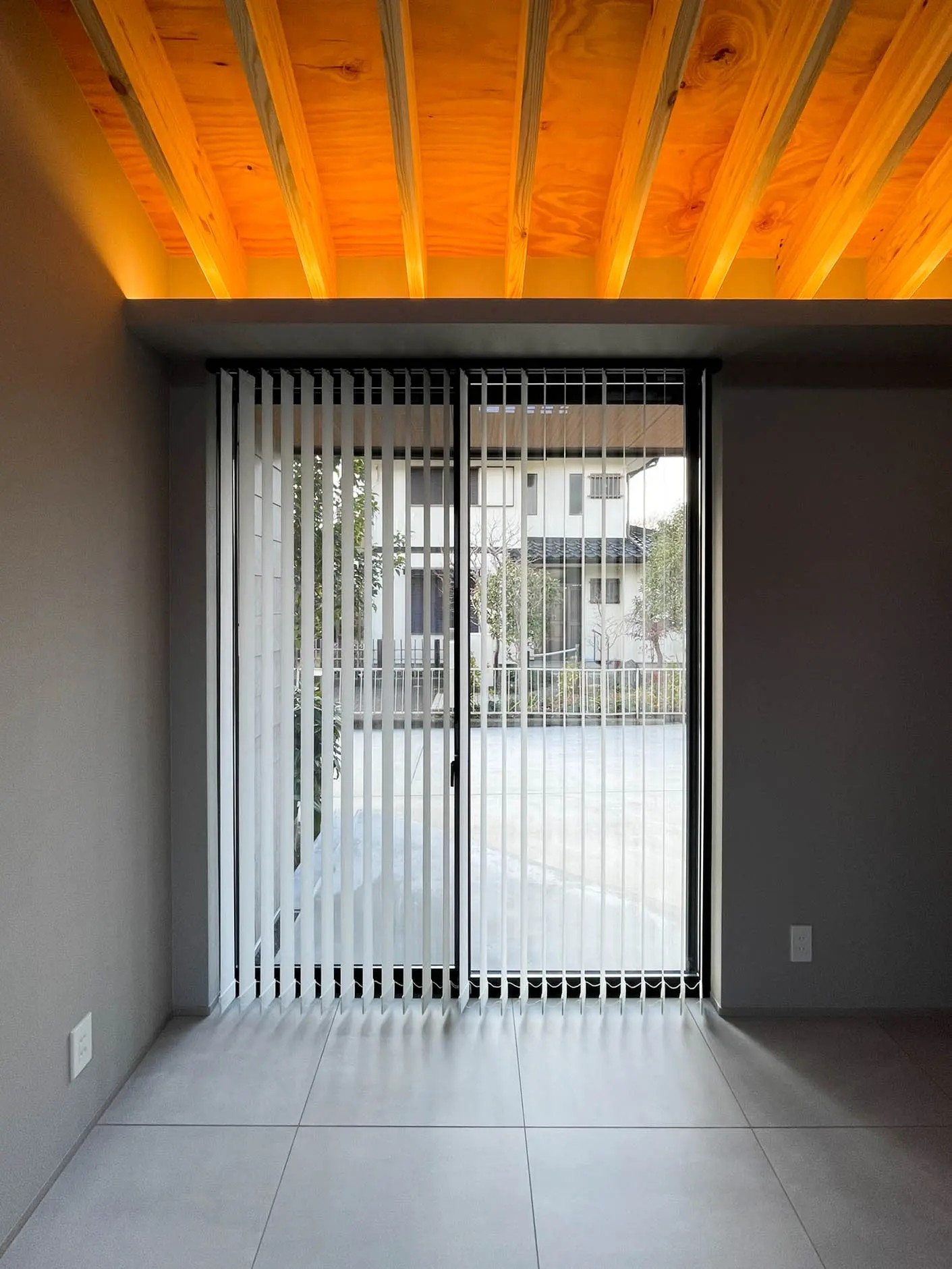 デザインの要は、構造材を現しにした化粧垂木の勾配天井です。アプローチの軒庇から続くこの天井が、柔らかな木質感とともに空間にリズミカルな表情を与えています。また、RC土間の階段アプローチや常緑樹、ウッドデッキが相まって、屋外との緩やかなつながりを感じさせる空間構成となりました。